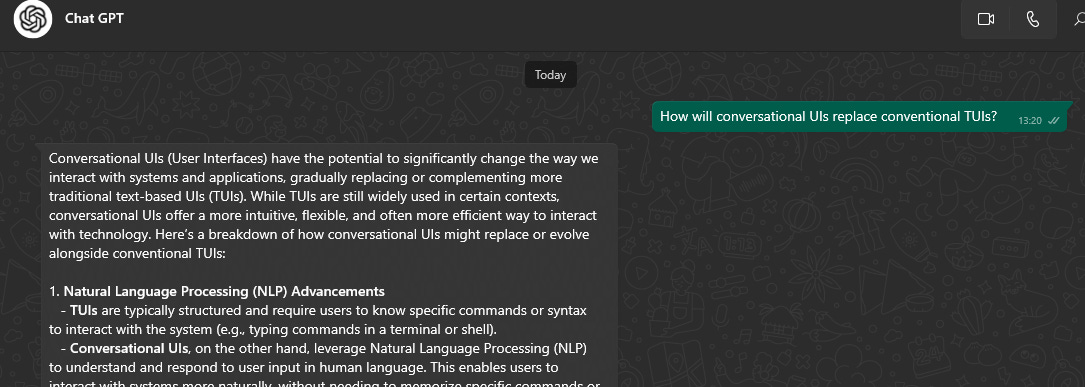 I think you mean death of the phone - not just of the TUI. Just another nail in the coffin for the telephone. Why would I want to talk to either an AI or a person on the phone if I could do what I needed to do any other way? Sure I still want to talk to my friends or work contacts but I’ll use Zoom, Whatsapp, whatever for this, not the phone. And for the things I need to use the phone for - many of which involve TUIs - I have no desire to ever pick up the phone for them.
