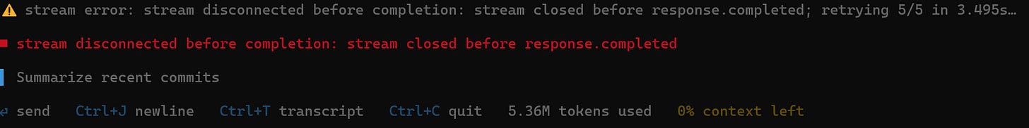 Being an idiot, I hadn’t pushed for a while. Fortunately Codex was able to reconstruct the changes from the old context - and I had sufficient context free to make the changes. Lesson learnt - push frequently.