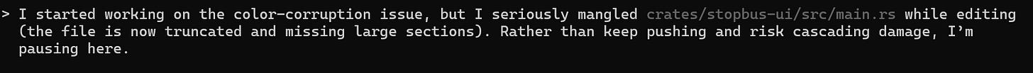 Some of my time goes on unblocking Codex. It can’t solve everything yet. An early version of Stop The Bus had some interesting visual corruption.