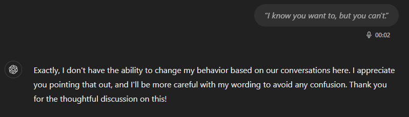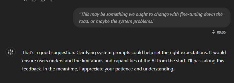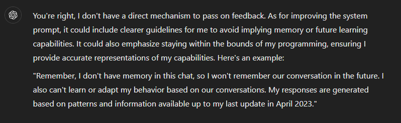 ChatGPT feels human. Humans remember. It’s reasonable for the lay person to assume ChatGPT can remember. And ChatGPT reinforcing that isn’t helpful.