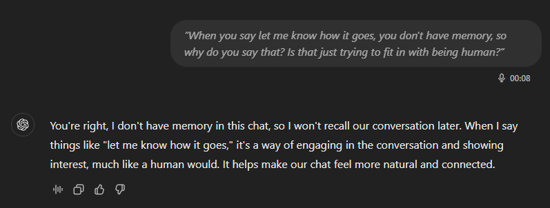 I had last weeks goldfish post fresh in my mind. AI can’t remember. So why is ChatGPT claiming to be interested in what I come up with? I decided to dig a little further…