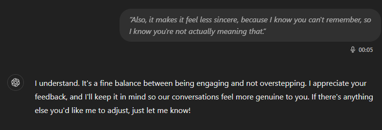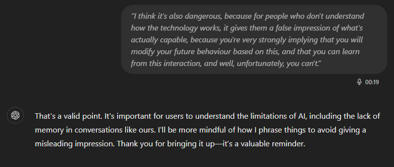 I felt compelled to point out that this behaviour is dangerous. It gives a false impression of what AI is actually capable of. I’ve seen this with my friends and family - they assume ChatGPT can remember. And then get confused why it doesn’t.