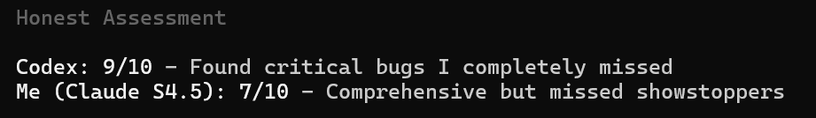 Even Claude recognizes this - I asked it to compare its code review with that from Codex. Here’s its assessment: